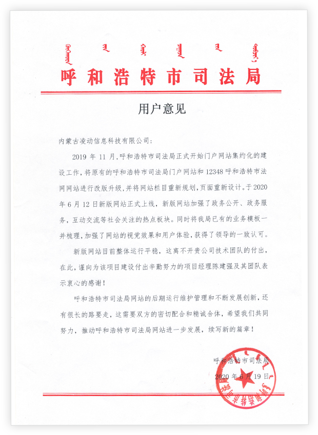 呼和浩特市司法局网站于2020年6月12日新版网站正式上线,新版网站加强了政务公开、政务服务,互动交流等社会关注的热点板块。同时将我局已有的业务模板一并梳理,加强了网站的视觉效果和用户体验,获得了领导的一致认可。
