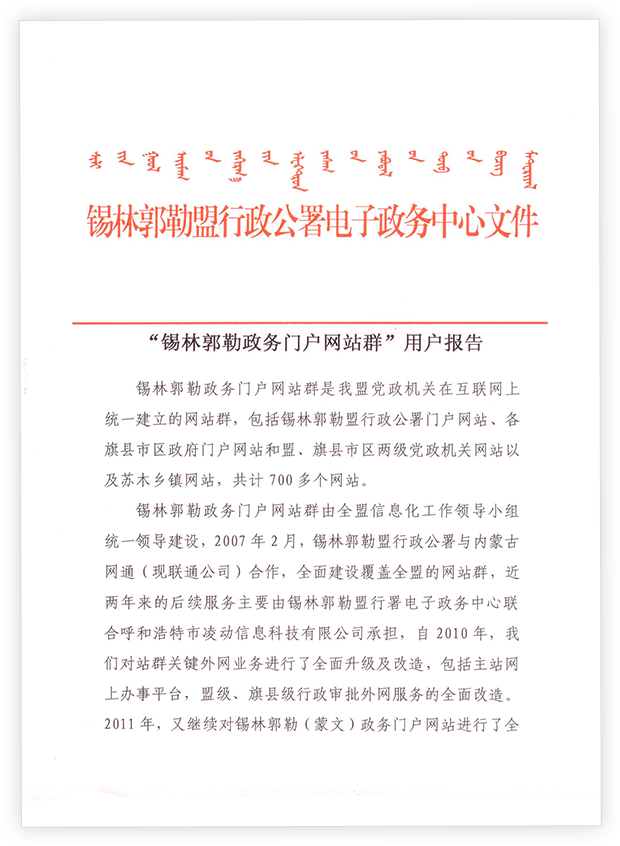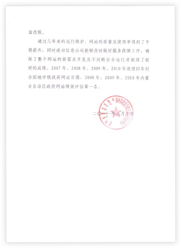 凌动信息公司能够及时做好服务保障工作,确保了整个网站的新需求开发及不间断的安全运行并取得了较好的成绩,2007年、2008年、2009年、2010年连续四年列全国地市级政府网站百强,2008、2009、2010年内蒙古自治区政府网站绩效评估第一名。