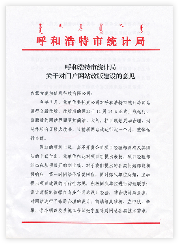2019年7月,我单位委托贵公司对呼和浩特市统计局网站进行全新改版,改版后的网站于11月14日正式上线运行,改版后的网站界面更加简洁、大气,栏目规划更加合理,浏览体验有了极大改善,目前新网站试运行近一个月,整体运行良好。