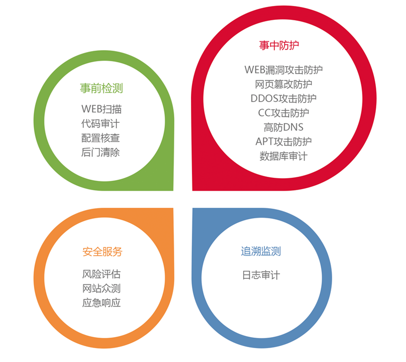 政府网站安全解决方案将遵从网站安全生命周期管理的模式,以事前阶段发现、感知风险;事中阶段监测、防御风险;事后阶段处置、响应为思路展开,以安全大数据、威胁情报等为安全源,提供深层次的纵深防护。